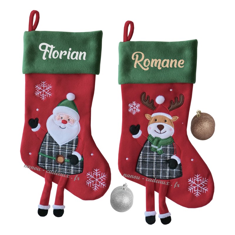 Grande botte chaussette de Noël brodée avec le prénom de votre choix en thermocollant pailleté ou velours.