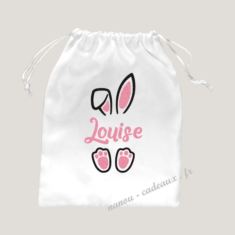 Sac pochon lapin de Pâques avec le prénom de votre choix en flex brillant pailleté